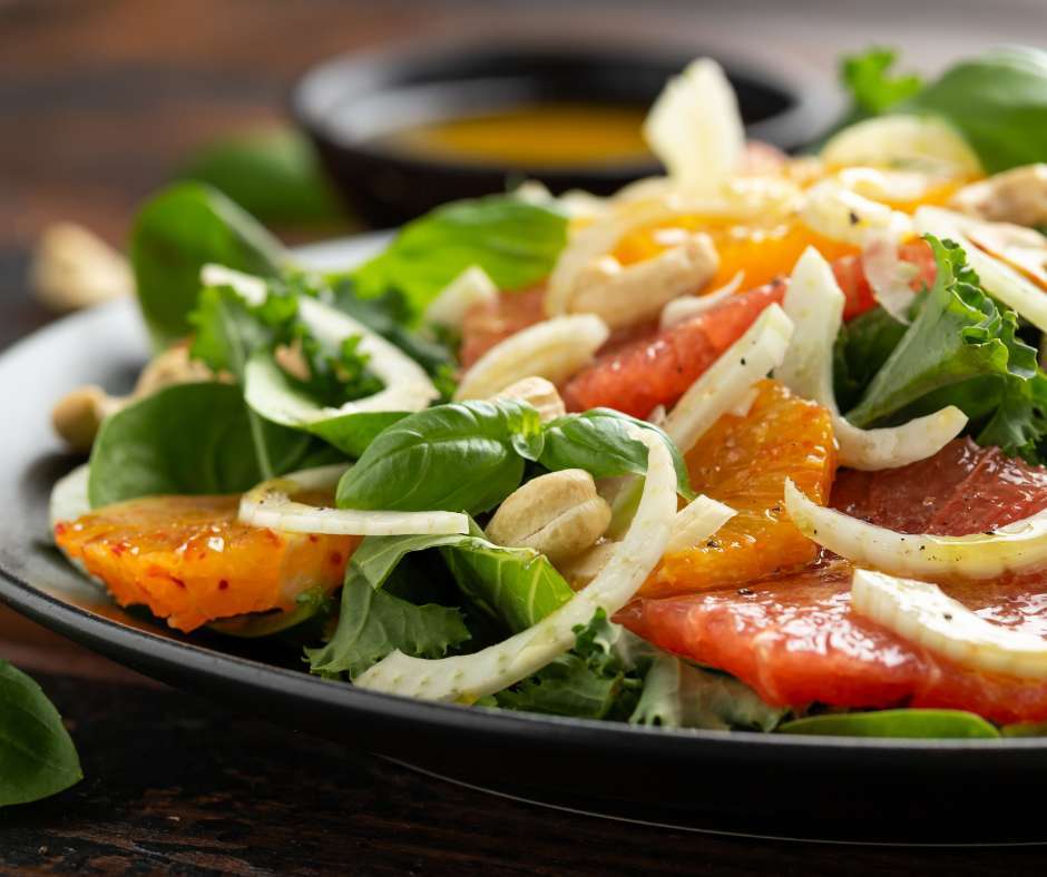 The menu: Citrus & fennel salad (thinly sliced fennel, orange and/or grapefruit segments, mixed greens salad, shaved Parmigiano-Reggiano, cashews).